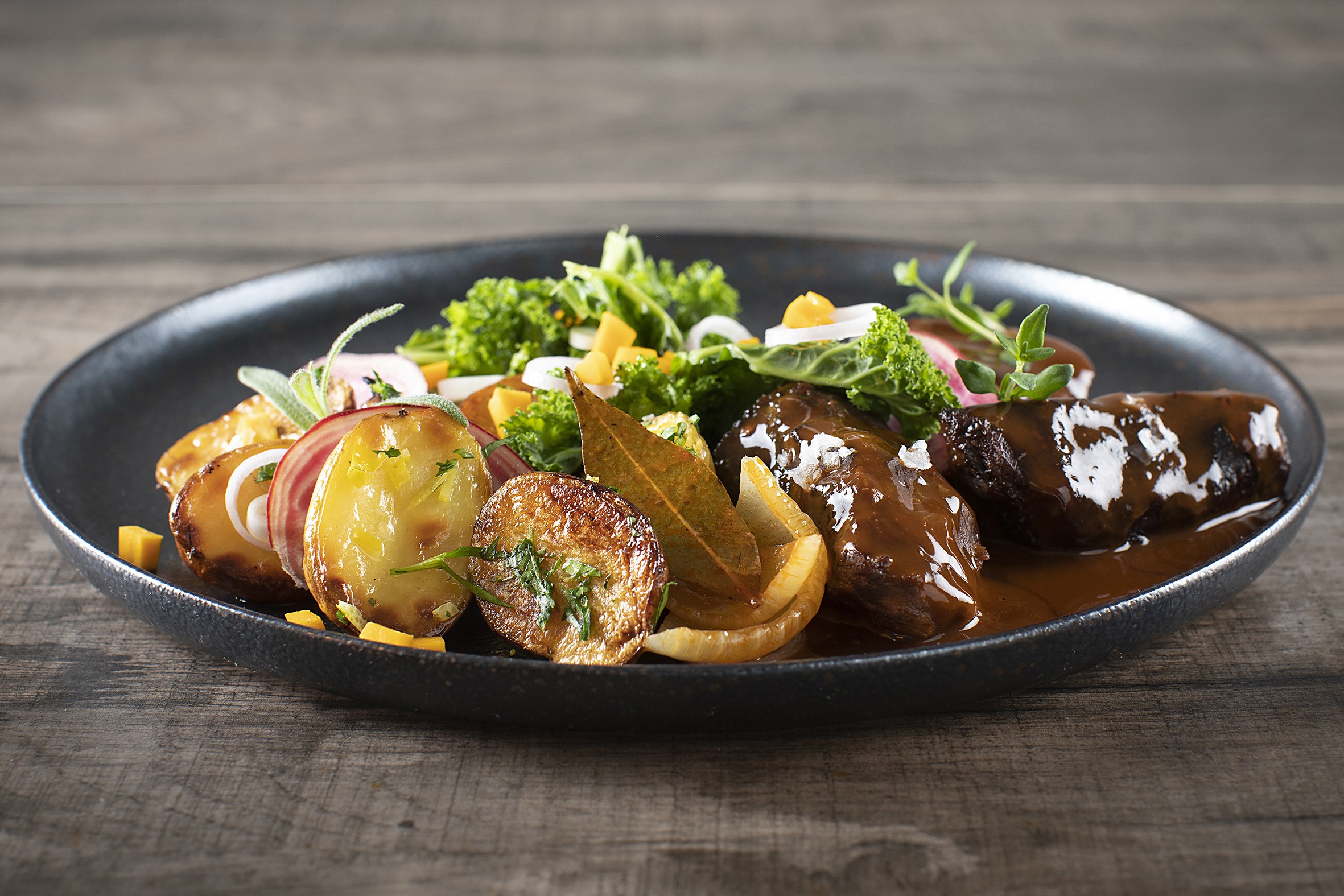 - Braiseret oksebøf i kraftig rødvinsglace.