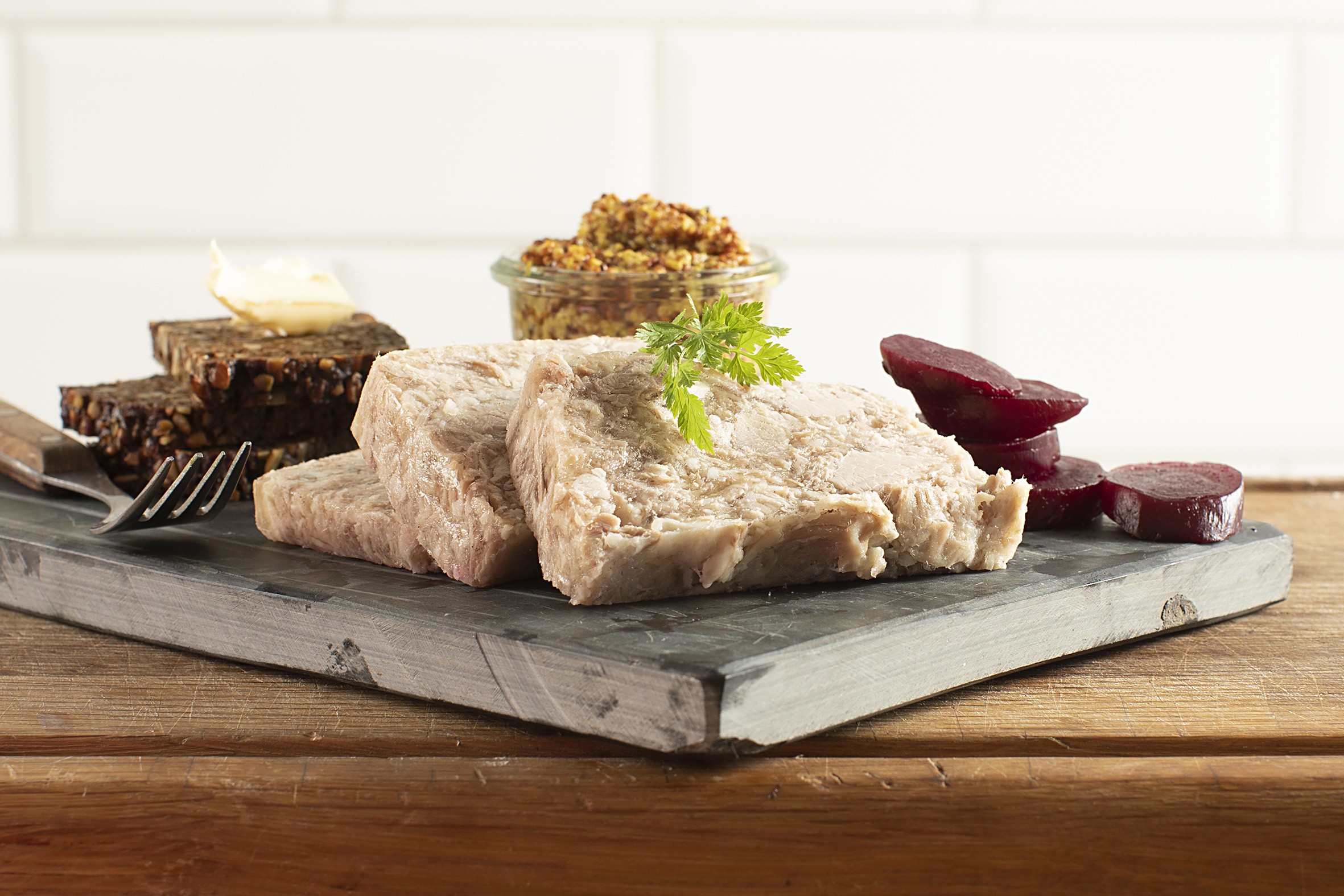 Krydert med peber, allehånde, løg og eddike. Ingredienser: Svinekød, suppe, hvidvinseddike og gelatine.