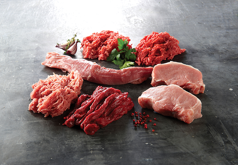 1 kg flæsk i skiver 4 stk. hakkebøffer 1 stk. forloren hare 4 stk. skaftkoteletter 1 stk. hamburgerryg