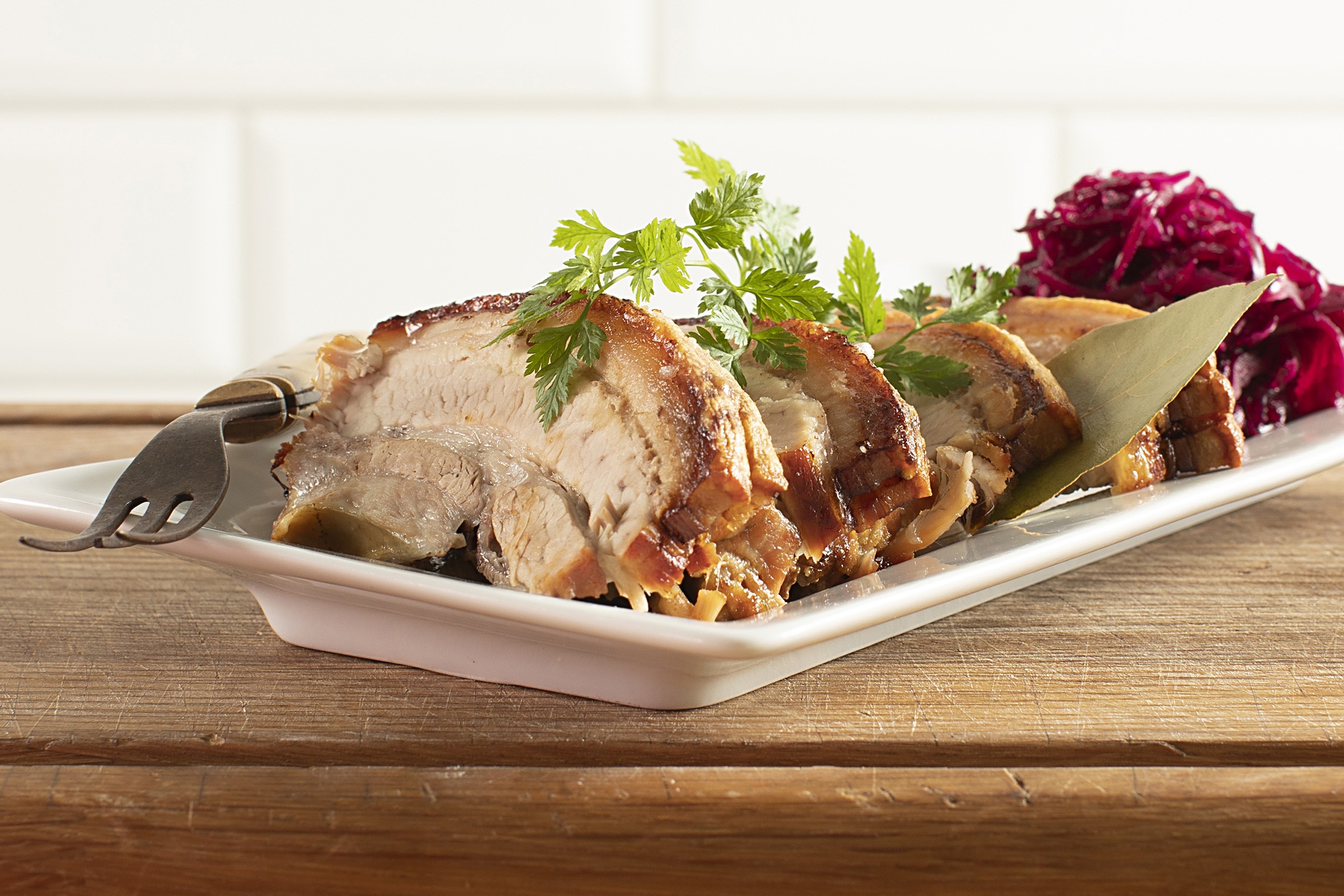Ribbenstegen varmes i ovnen i ca. 25- 30 minutter ved 180°C i forvarmet ovn.
